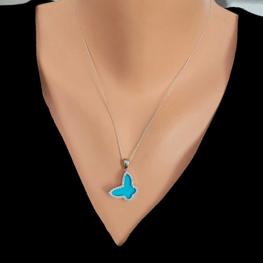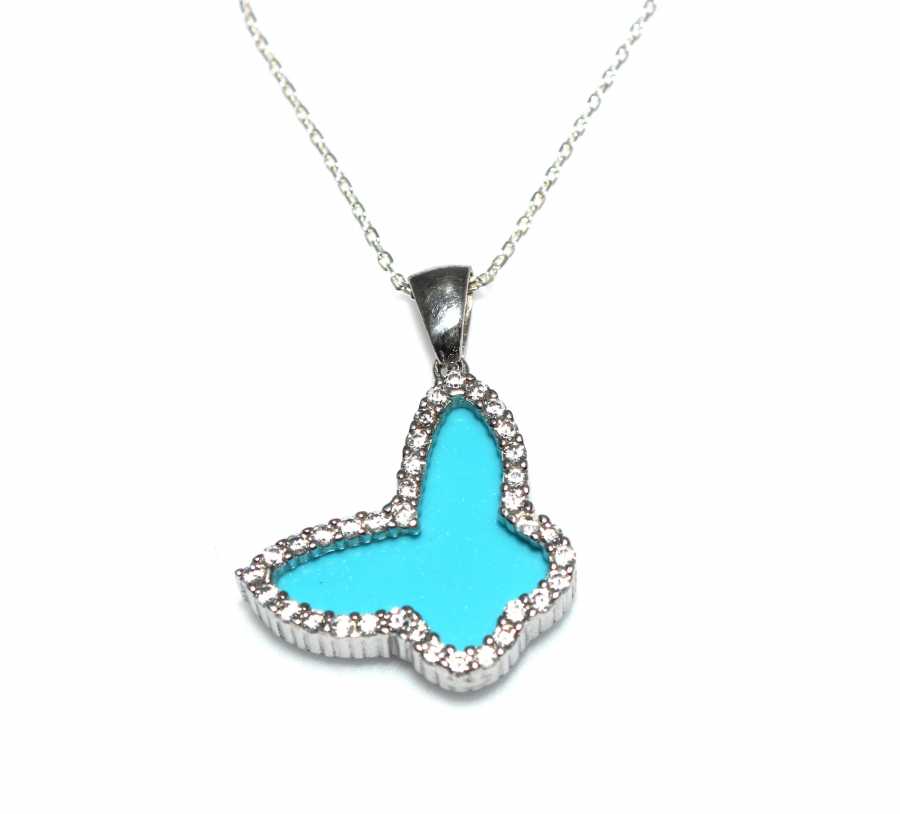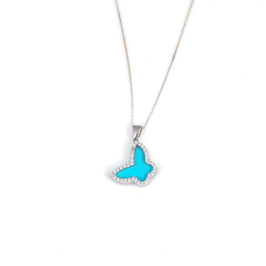 925 Ayar Gümüş Turkuaz Taşlı Kelebek Kolye, Beyaz