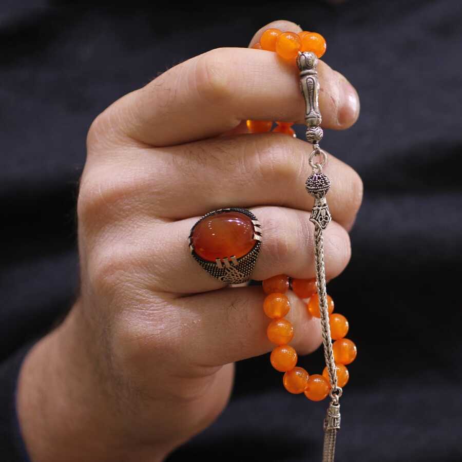 925 Ayar Gümüş Turuncu Renkli Kehribar Tesbih