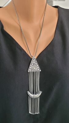 Gümüş kolye 925 ayar gümüşten yapılmıştır. Gümüş kolye tilki kuyruğu zincirli ve 62 cm uzunluğundadır. Kolye ucu 16 cm uzunluğundadır. Üçgen parçanın boyutu 3,7 cm'ye 3,4 cm ve ay şeklindeki parça 4,2 cm'ye 2,4 cm boyutlarındadır. Kolye taşsızdır. Ağırlığı 38,38 gramdır.