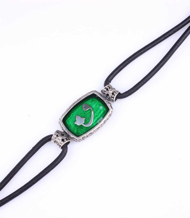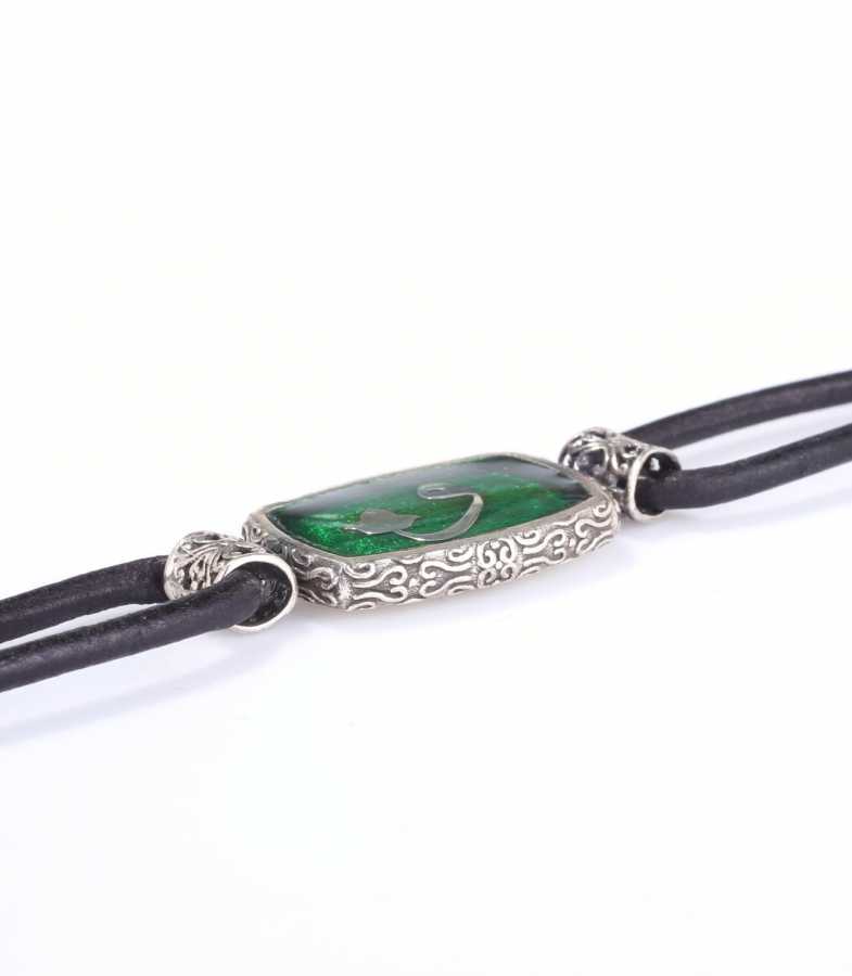 Gelince Haber Ver925 ayar gümüştür. Vav harfli yeşil minelidir. Deri bileklik uzunluğu: 19,5 cm Gramı: 14,61