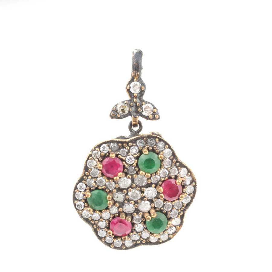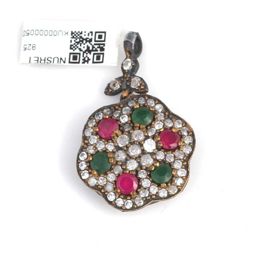 925 Ayar Gümüş ve Bronz Karışımı Çiçek Motifli Yakut ve Zümrüt Taşlı Kolye Ucu