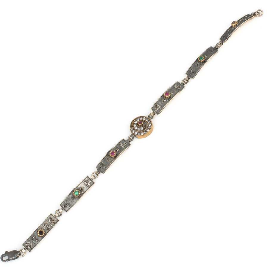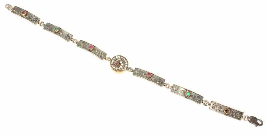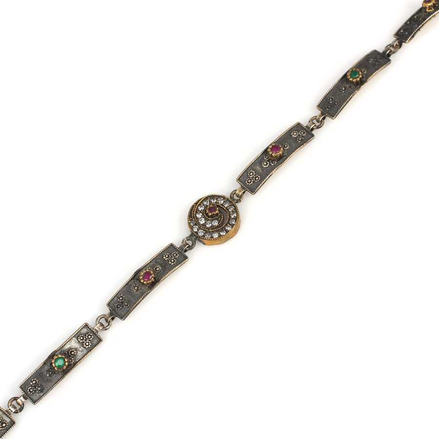 925 Ayar Gümüş ve Bronz karışımı 1,3 x 19,5 cm, yakut ve zirkon taşlı otantik bileklik. Gramı: 10,03