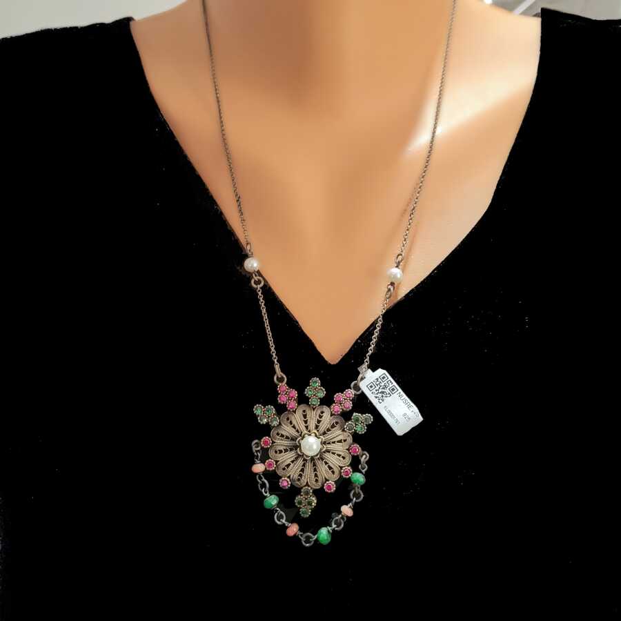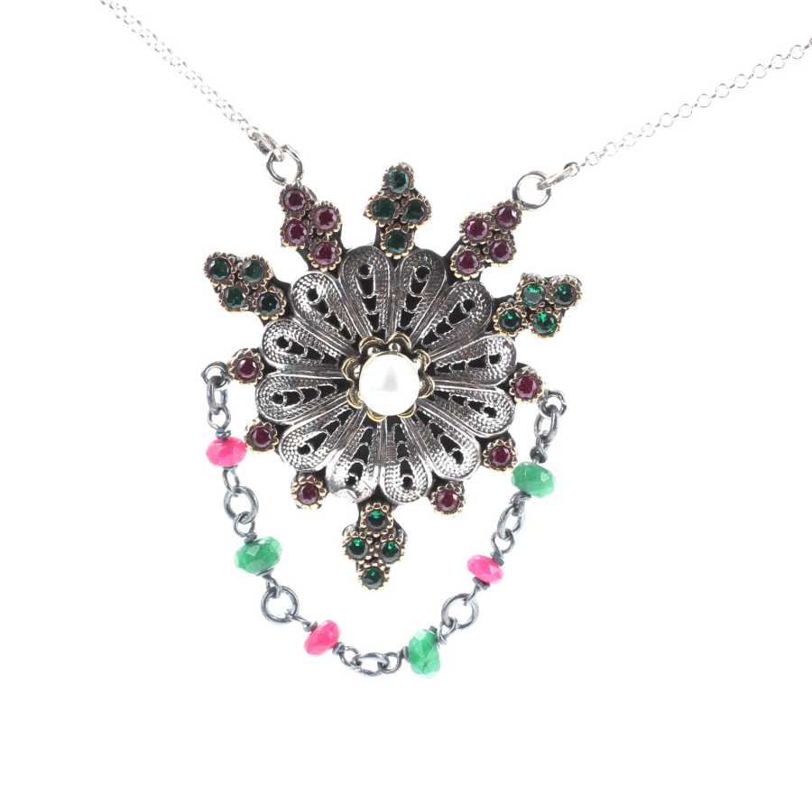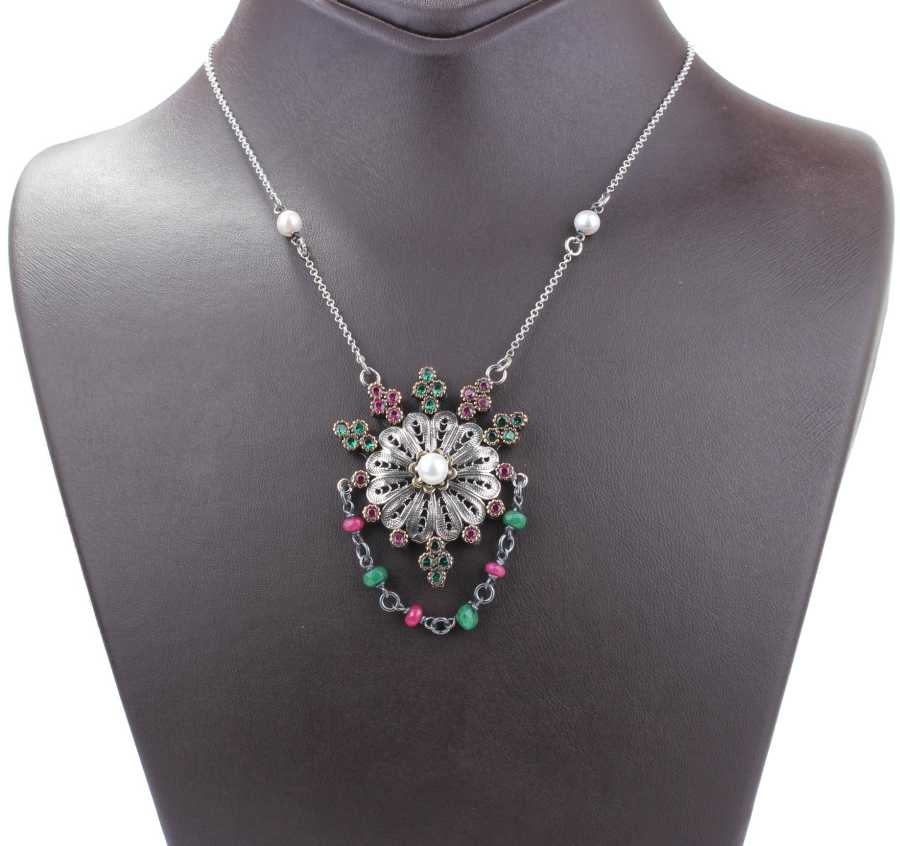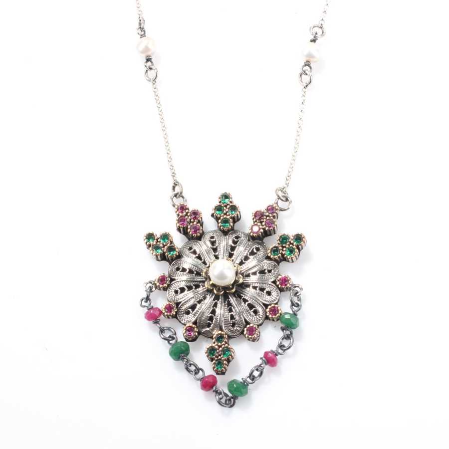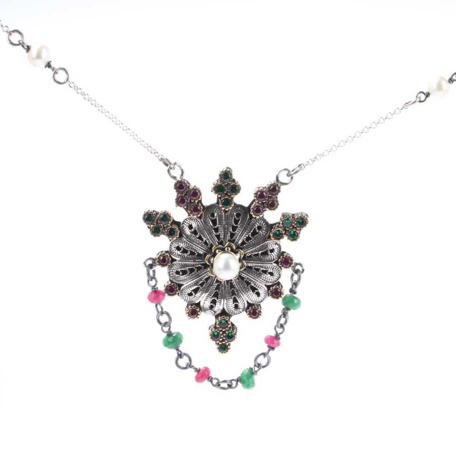 925 Ayar Gümüş ve Bronz Karışımı İnci, Yakut ve Zümrüt Taşlı Telkari Otantik Kolye