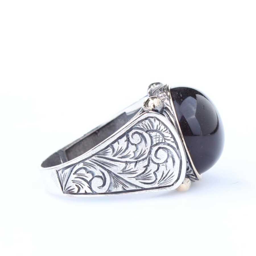 925 ayar gümüş ve bronz karışımı yüzük. Beyaz renktedir. Kahverengi akik taşlıdır. Üst kısmının Boyutu: 1,8 cm dir. Resimdeki yüzüğün ölçüsü 26 no dur ama istenilen ölçüde yapılır. Gramı: 12,4