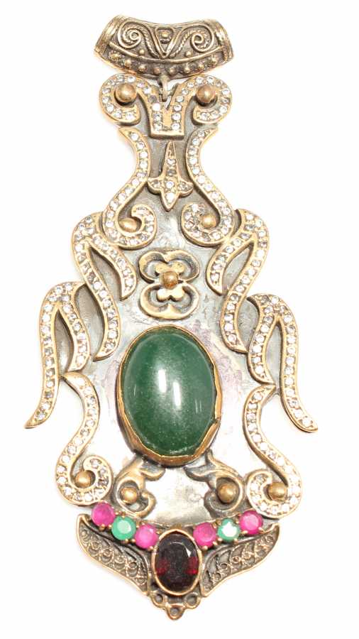Kolye ucu 925 ayar gümüş ve bronzdan imal edilmiştir. Büyük şekilsiz kolye ucu 4,3 cm'ye 9,0 cm boyutlarındadır. Zincir dahil değildir. Kolye ucu sentetik yakut, zümrüt ve zirkon taşları vardır. Otantik kolye ucu 33,3 gram ağırlığındadır.