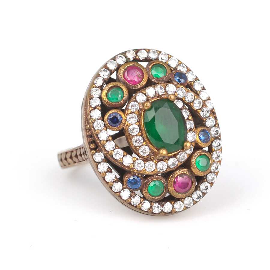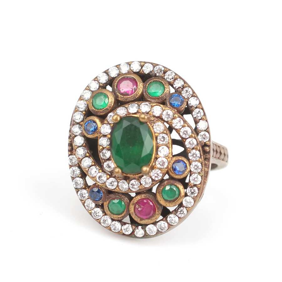 Notify me when its in stock925 ayar gümüş ve bronz karışımı yüzüktür. Zümrüt safir yakut ve zirkon taşlı, 17 numara ölçüsündedir. Gramı: 9,23 gr