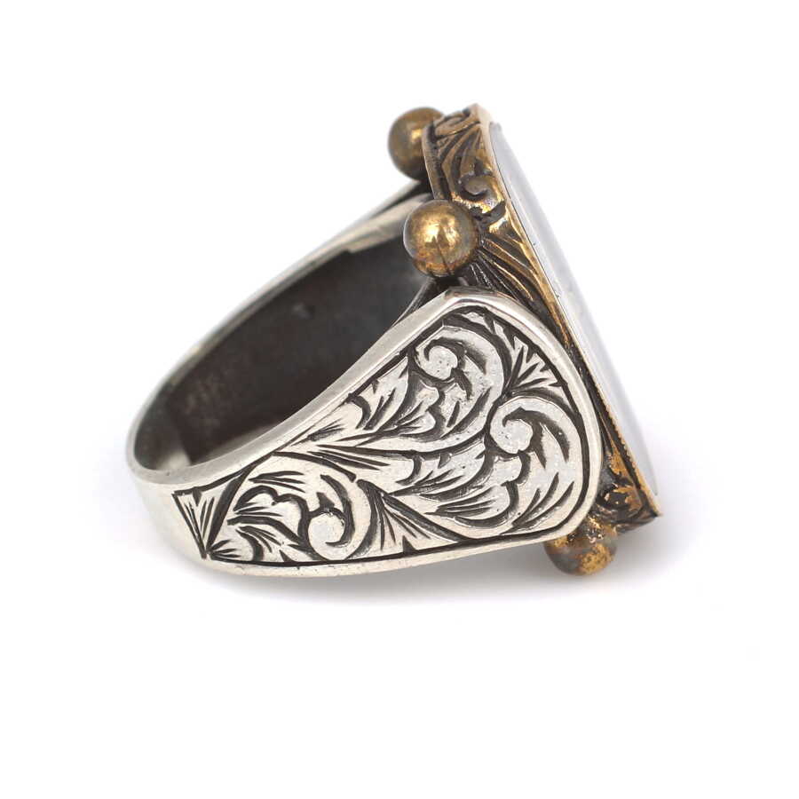 Yan yüzeylerdeki Osmanlı esintili motifler ustalıkla işlenmiş olup yüzüğe geleneksel bir karakter katar. Güçlü formu ve ağır duruşu sayesinde hem günlük kullanımda hem özel davetlerde stilinizi tamamlar. Babaya, eşe, kardeşe ya da sevdiğiniz birine hem anlamlı hem de prestijli bir hediye arıyorsanız, zamansız ve koleksiyonluk bir tercihtir.