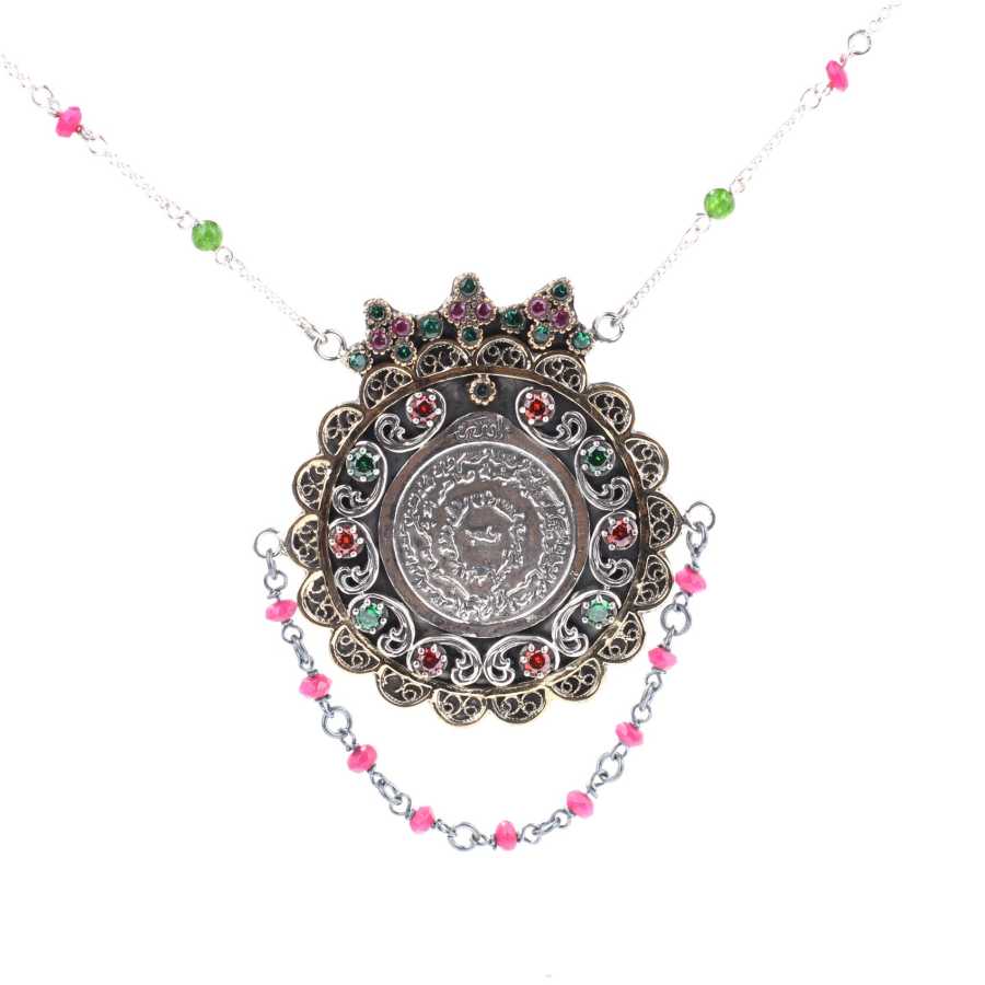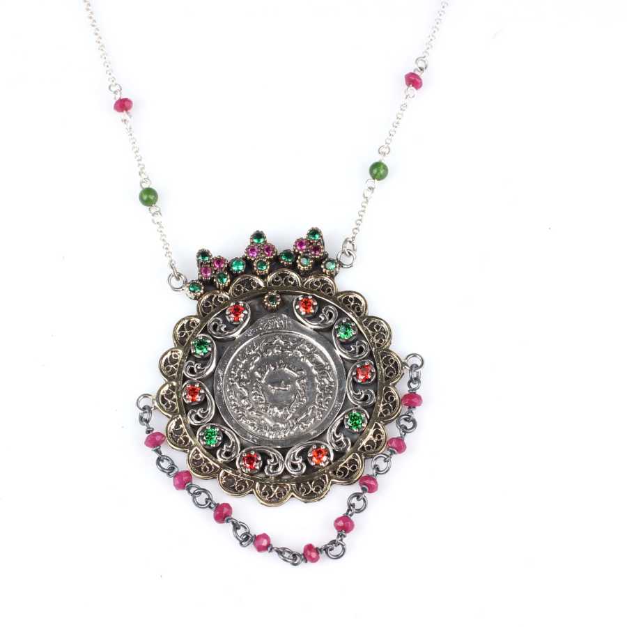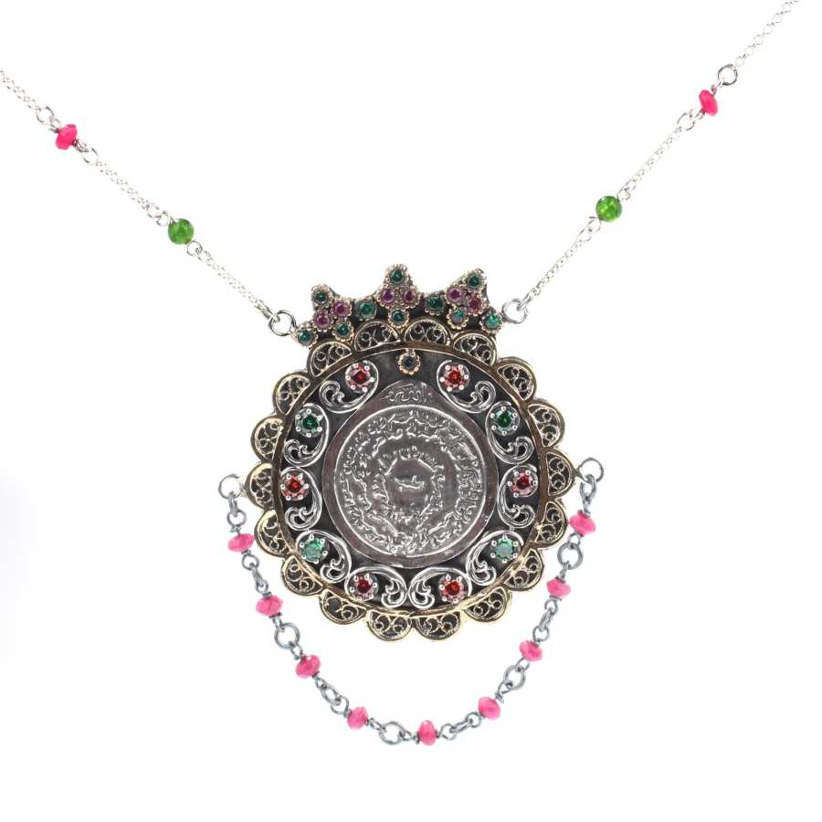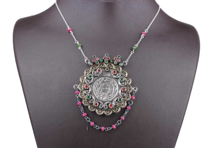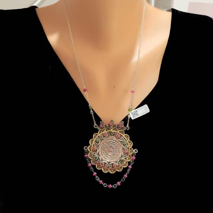 Gümüş telkari kolye, 925 gümüş ve üzerinde bronz parçalar mevcuttur. Otantik kolye 6,0 cm'ye 4,5 cm boyutlarında ve 60 cm uzunluğundadır. Kolye ucunda kıtri duası vardır. Kolyede kök yakut, kök zümrüt ve zirkon taşları bulunmaktadır. Ağırlığı 22,64 gramdır.