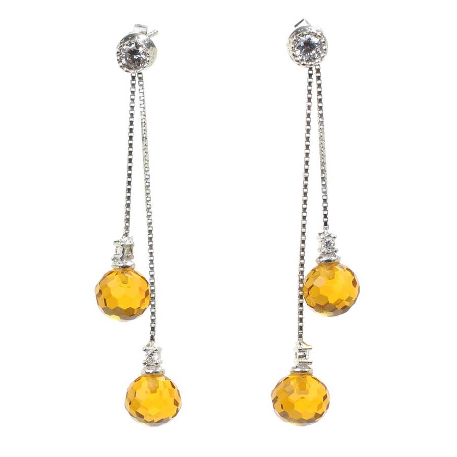925 ayar gümüştür. Çivi tepelik yuvarlak şeklinde ki kısmında beyaz zirkon taşlıdır. Küpe sallantısının uzunluğu: 5 cm dir. Küpe tepeliğinin altından 2 zincir ile Sitrin rengi Swarowski taş ile sallandırılmıştır. Sitrin renk swarowski taş boyutu: 0,8 cm dir.