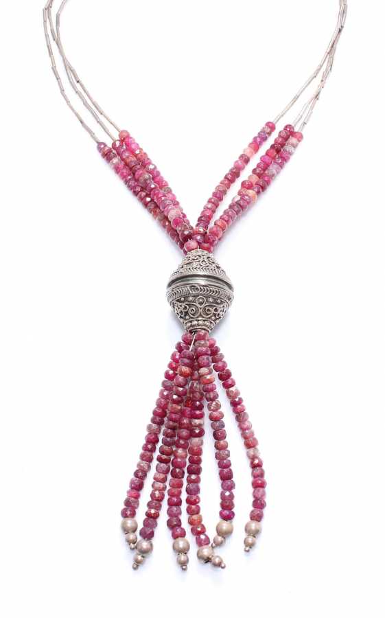 Gümüş kolye 925 ayar gümüşten üretilmiştir. Gümüş kolye 44 cm uzunluğundadır. Yakut taşlar ile şarnel borular eklenerek dizilmiş 3 sıralı kolyedir. Ağırlığı 55,08 gramdır.