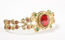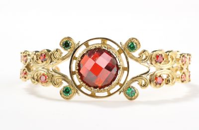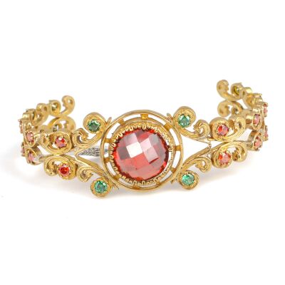 925 ayar gümüştür. sentetik yakut ve yeşil kırmızı zirkon taşlıdır. Bileziğin altı açıktır. Kalınlığı 2,5 cm genişlik 7,2 cm'dir.Gramı: 26,51