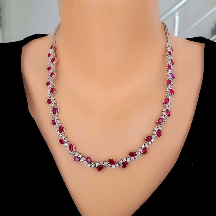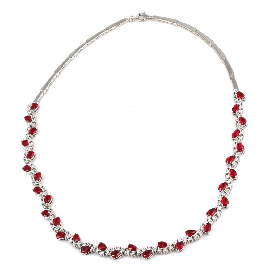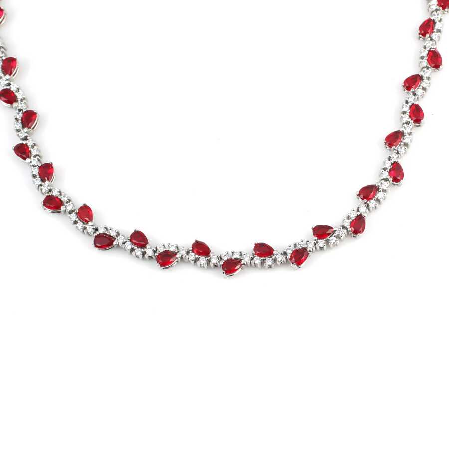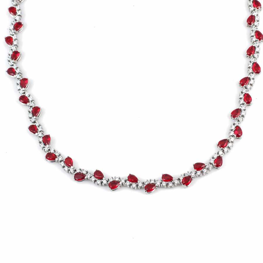 Gümüş kolye 925 ayar gümüşten yapılmıştır. Gümüş fantezi kolye 45 cm uzunluğundadır. Su yolu kolye 0,8 cm enindedir. Kolye kırmızı ve beyaz renk zirkon taşlıdır. Ağırlığı 23,51 gramdır.