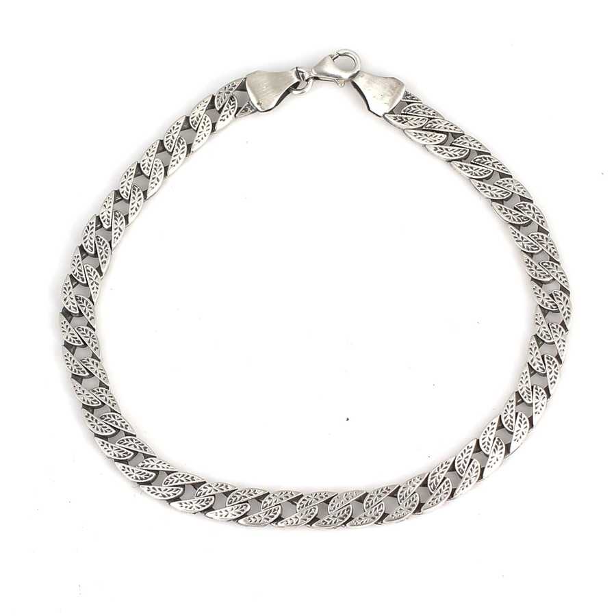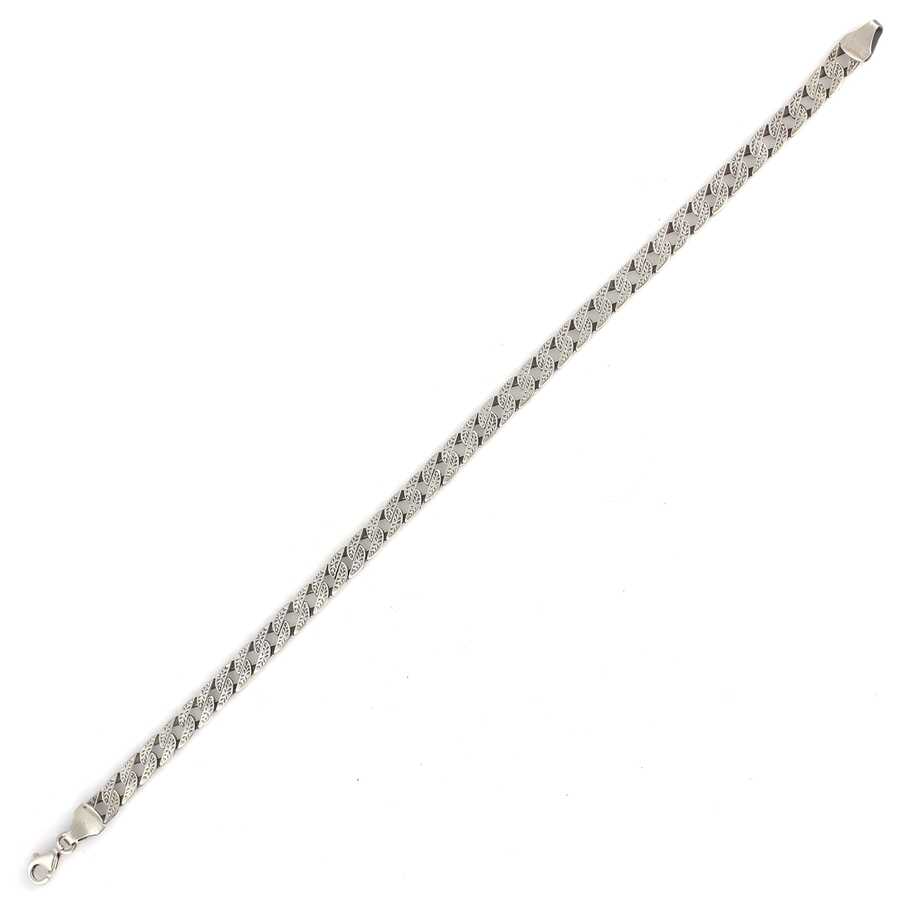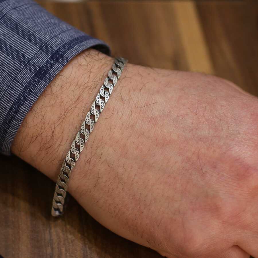 Bileklik 925 ayar gümüşten imal edilmiştir. Gurme mat zincir model bileklik 22 cm uzunluğundadır.Bileklik 0,55 cm boyutlarındaki desenli halkalardan oluşur. Gümüş bileklik 10,93 gram ağırlığındadır.