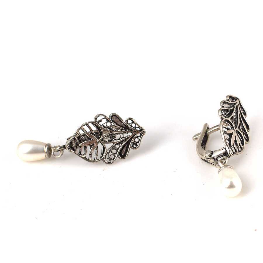 925 Ayar Gümüş Yaprak Motifli İnci Sallantılı Küpe