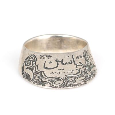 Yüzük 925 ayar gümüşten üretilmiştir. İsim yazılı model zihgir yüzüğün üzerinde "Yasin" ismi yazmaktadır. Yüzük 1,7 cm enindedir. Resimdeki yüzük 27 ölçüdür, ancak tüm ölçüler yapılabilmektedir. Yüzük taşsızdır. Ağırlığı 10,04 gramdır.