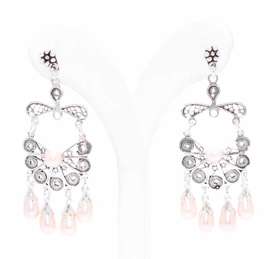 925 Ayar Gümüş Yelpaze Desenli İnci Taşlı Telkari Küpe