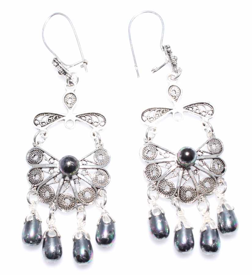 925 Ayar Gümüş Yelpaze Desenli Siyah İnci Taşlı Telkari Küpe