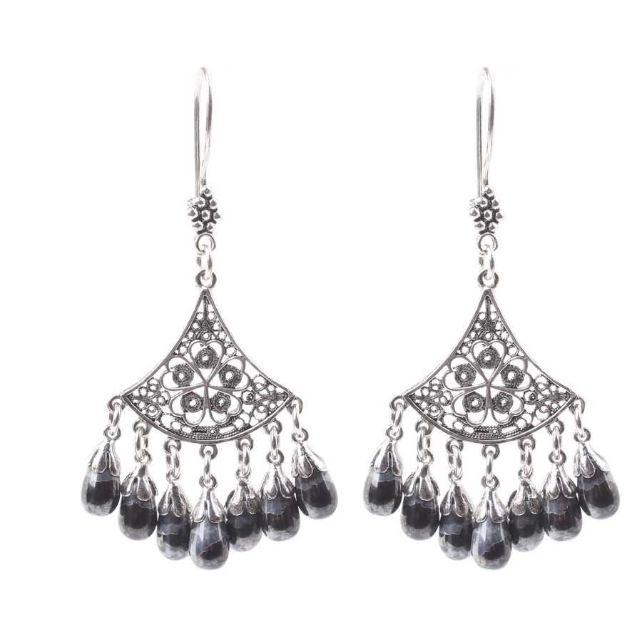 925 Ayar Gümüş Yelpaze Model Siyah İnci Taşlı Telkari Küpe