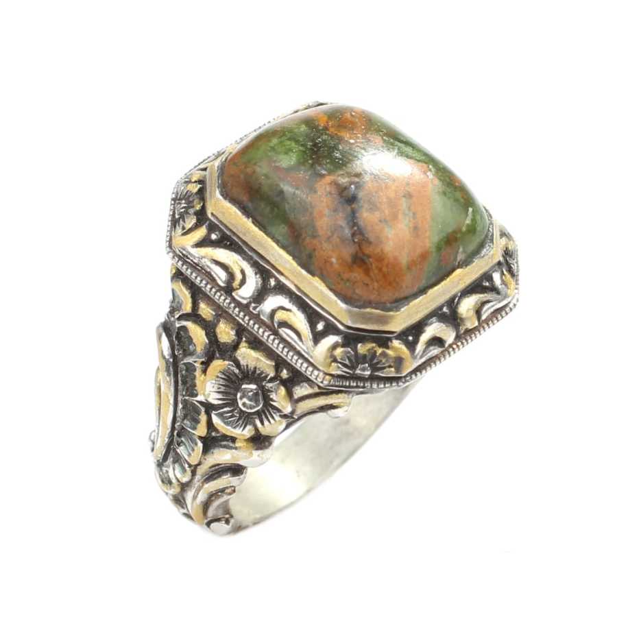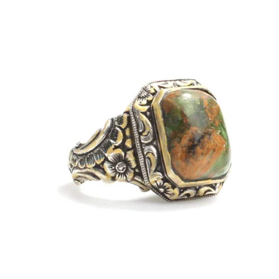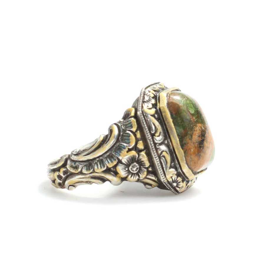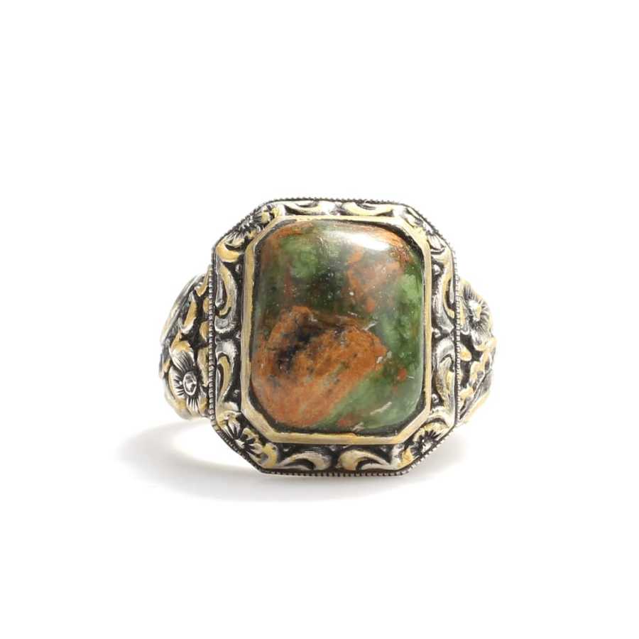 Yüzük 925 ayar gümüşten üretilmiştir Yüzüğün üzerinde el kalemi atılarak tasarlanmıştır. Taşlı yüzük 1,1 cm'ye 1,4 cm boyutlarındadır. Resimdeki yüzük 18 ölçüdür, ancak tüm ölçüler özel olarak yapılabilmektedir. Yüzük yeşil akik renk taşlıdır. Ağırlığı 11,22 gramdır.