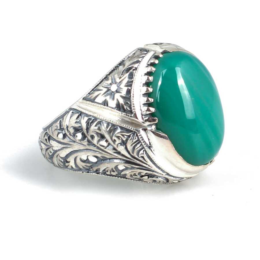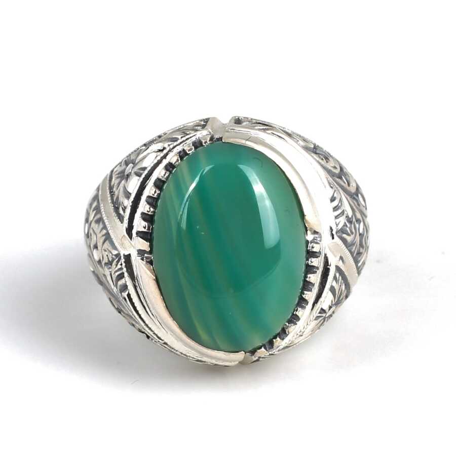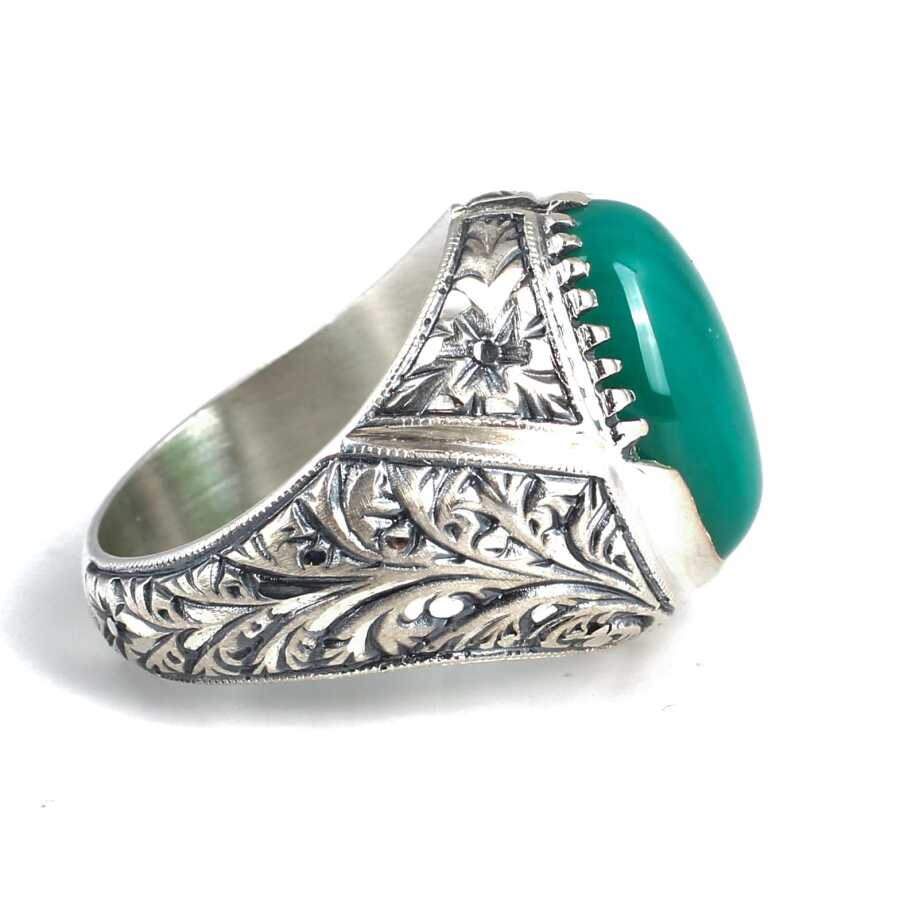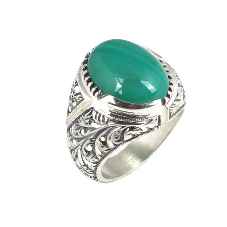 Notify me when its in stock Yüzük 925 ayar gümüşten üretilmiştir. Yüzüğün üzerinde el kalemi atılarak tasarlanmıştır. Yüzüğün üst kısmı 1,9 cm'ye 1,5 cm boyutlarındadır. Resimdeki yüzük 23 ölçüdür, ancak tüm ölçüler özel olarak yapılabilmektedir. Yüzük yeşil akik renk taşlıdır. Ağırlığı 22,06 gramdır.
