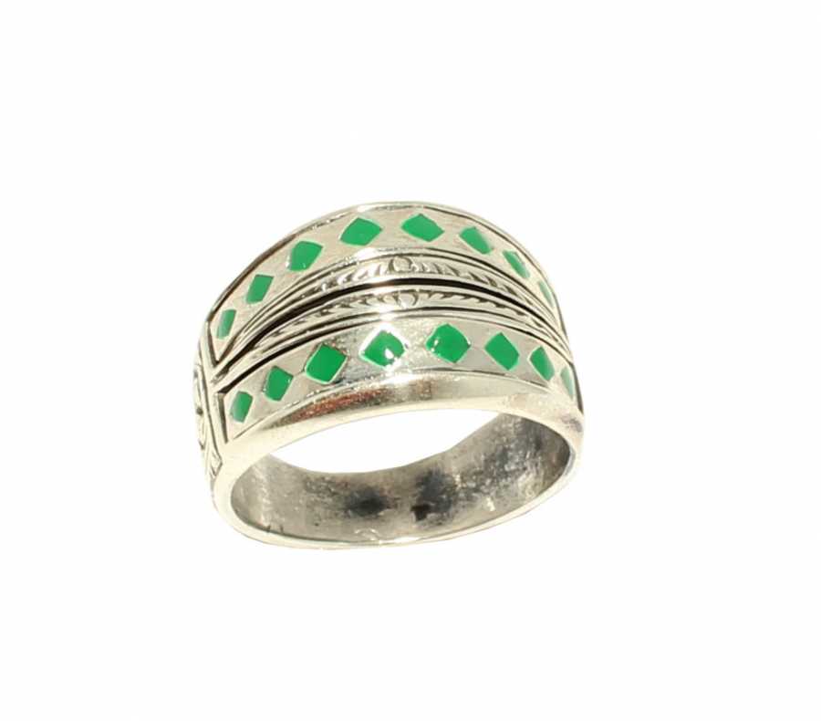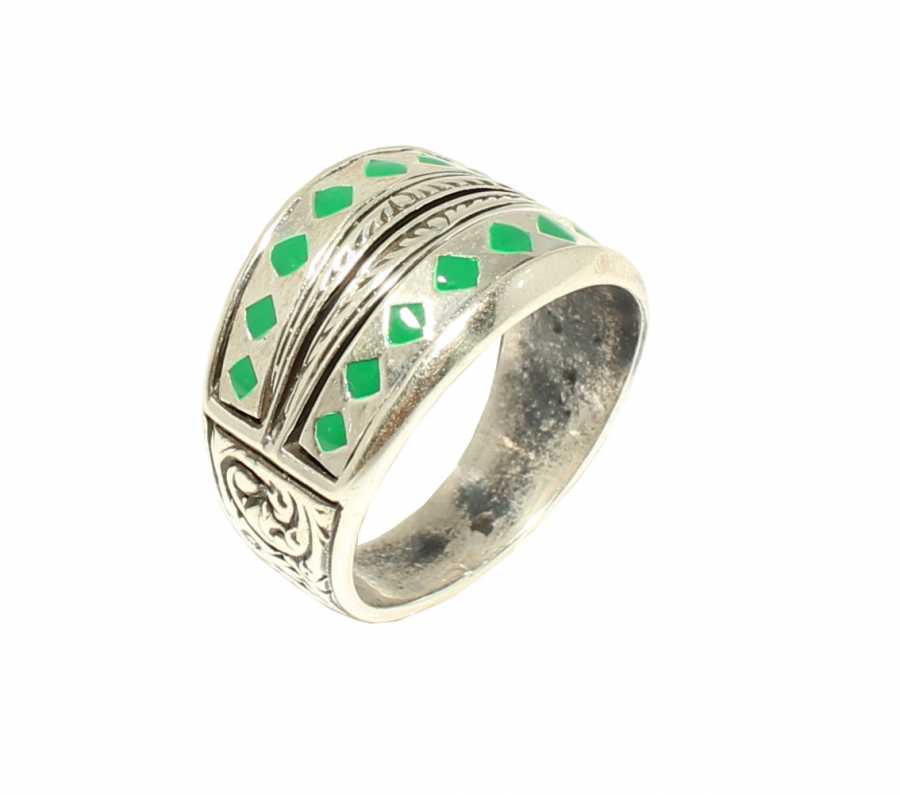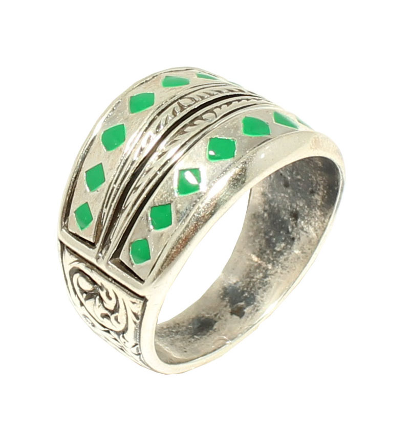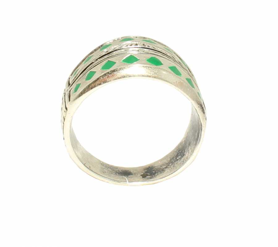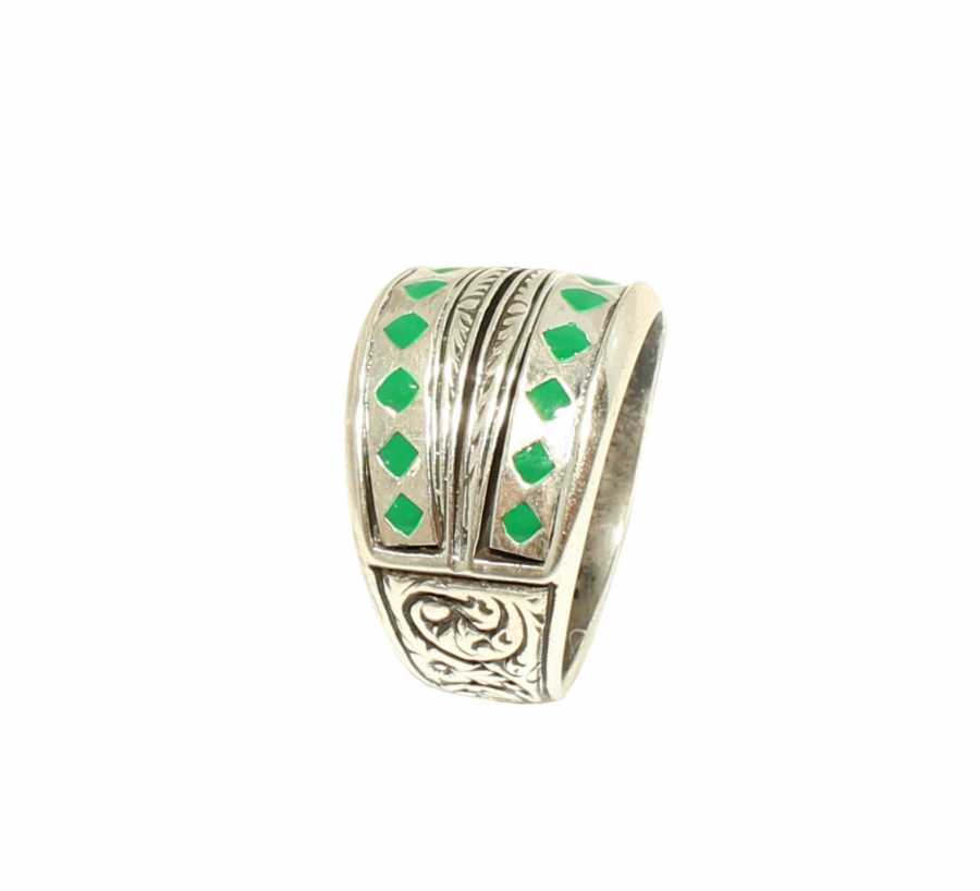 Yüzük 925 ayar gümüşten üretilmiştir. Gümüş yüzüğün üst kısmı yeşil renk mine yapılmıştır. Yüzüğün üst kısmı 2,0 cm'ye 2,1 cm boyutlarındadır. Resimdeki yüzük 20 ölçüdür, ancak tüm ölçüler yapılabilmektedir. Yüzük taşsızdır. Ağırlığı 9,25 gramdır.