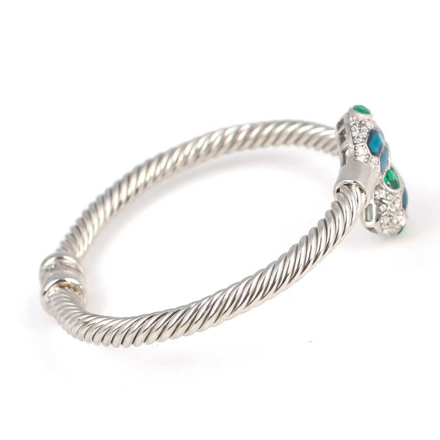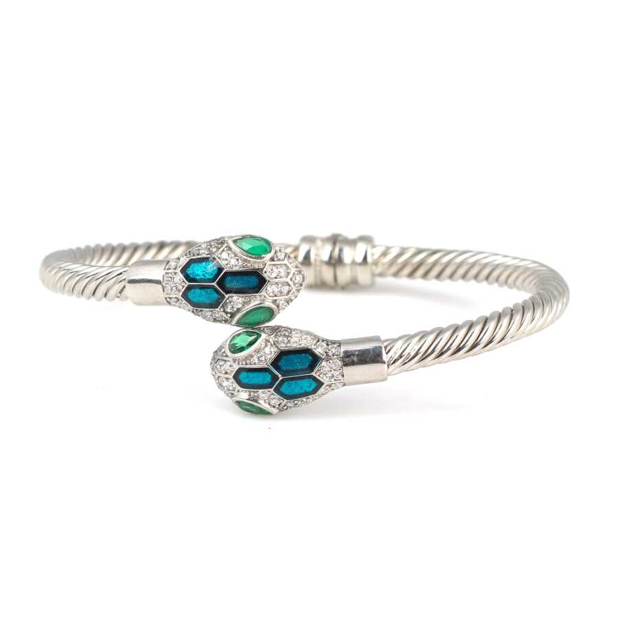 Gelince Haber VerBilezik 925 ayar gümüşten imal edilmiştir. Yılan başı model 6 tel burgu bilezik 6,3 cm çapındadır. Bileziğin üst kısmı 1,2 cm genişliğindedir. Bilezik mavi renk mine, beyaz ve yeşil zirkon taşlıdır. Bilezik yaylıdır.Ağırlığı 26,5 gramdır.