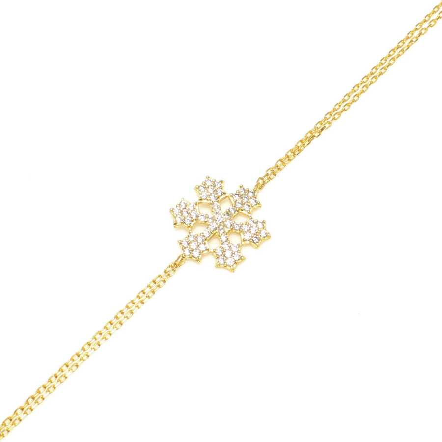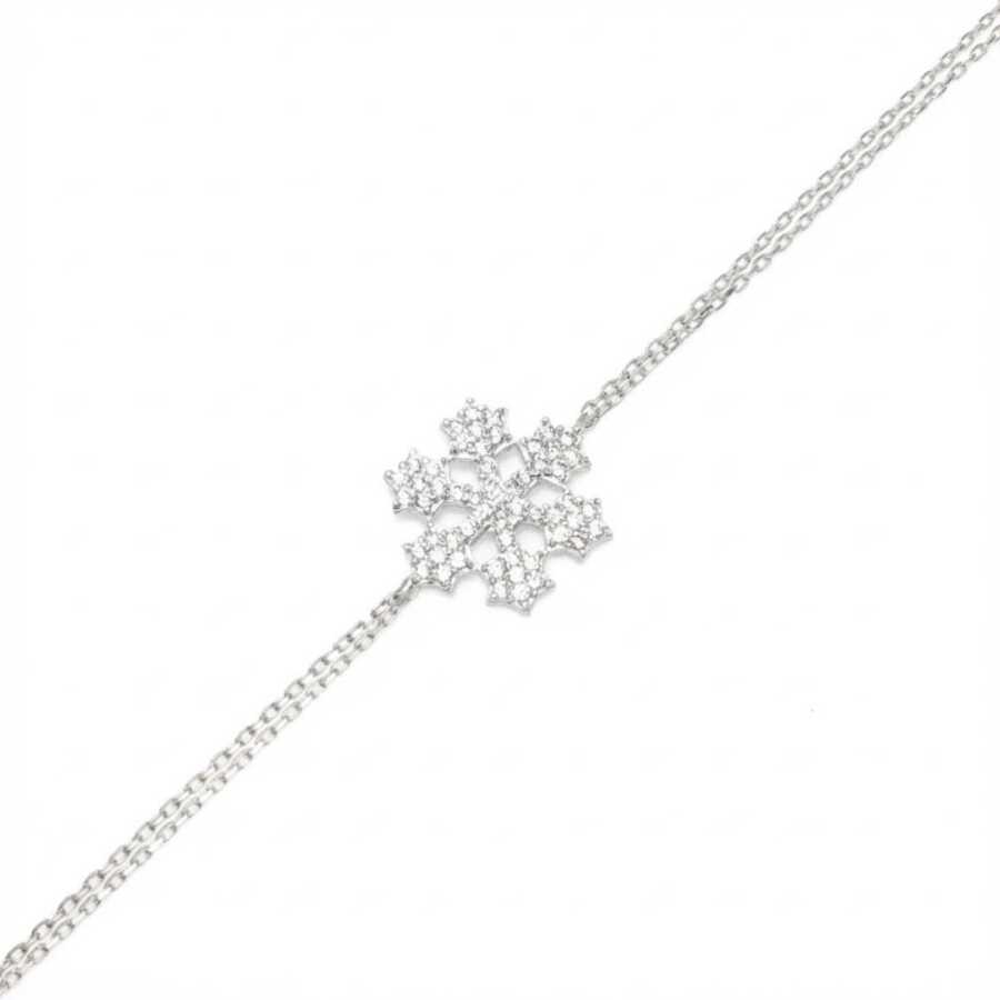 Bileklik 925 ayar gümüşten imal edilmiştir. Taşlı bileklik 22 cm uzunluğundadır. Kar tanesi figürü 1,5 cm boyutlarındadır. Bileklik çift zincirli ve zirkon taşlıdır. Gümüş bileklik 2,3 gram ağırlığındadır.