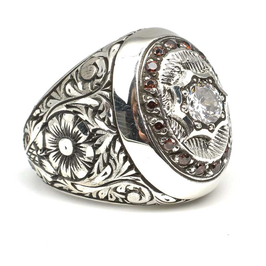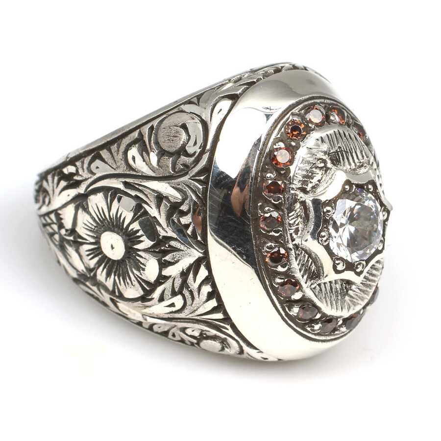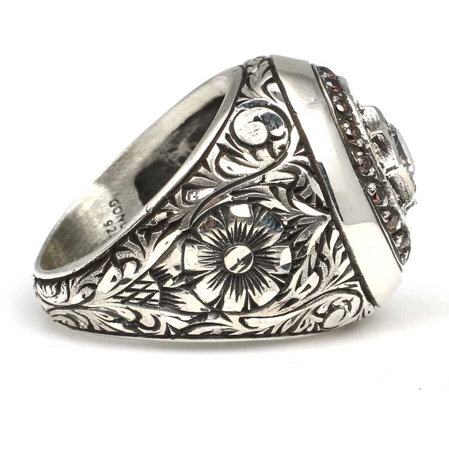 Yüzük 925 ayar gümüşten üretilmiştir. Yüzüğün üzerinde el kalemi atılarak tasarlanmıştır. Taşlı yüzük 2,4 cm'ye 2,1 cm boyutlarındadır. Resimdeki yüzük 23 ölçüdür, ancak tüm ölçüler özel olarak yapılabilmektedir. Yüzük zirkon taşlıdır. Ağırlığı 20,84 gramdır.