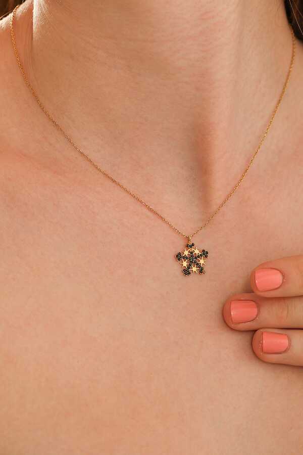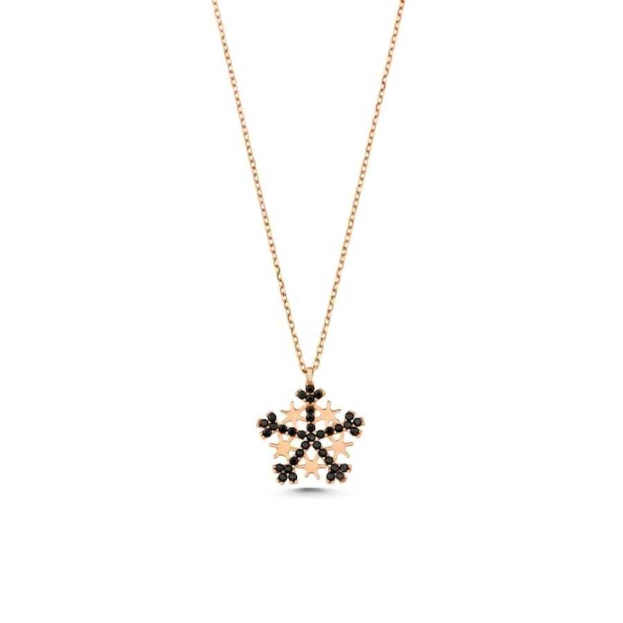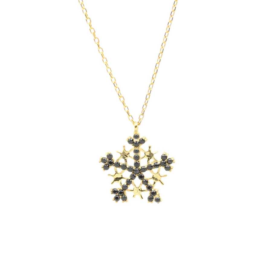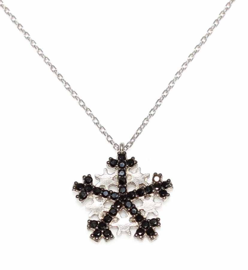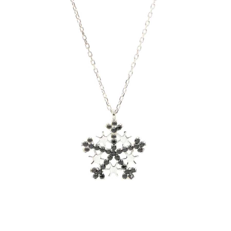Gümüş kolye 925 ayar gümüşten yapılmıştır. Kar tanesi şeklindeki kolye tepelik dahil 1,8 cm'ye 1,6 cm boyutlarındadır. Zinciri 45 cm uzunluğundadır ve taşları siyah zirkondur. Ağırlığı 2,4 gramdır.