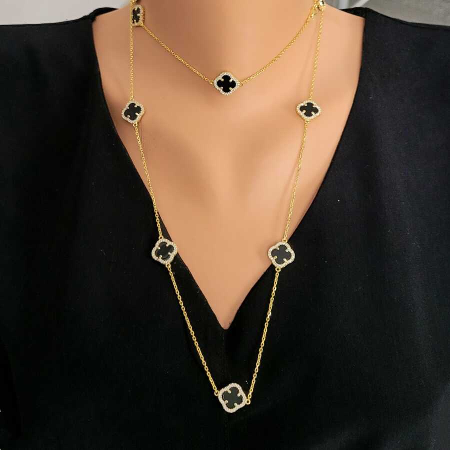 Gümüş kolye 925 ayar gümüşten yapılmıştır Yonca model kolye 97 cm uzunluğundadır Kolye üzerinde 11 adet yonca figürü mevcuttur Yonca figürü 1,0 cm boyutunda zirkon ve oniks taşlıdır . Ağırlığı 22,27 gramdır.