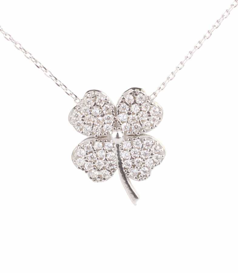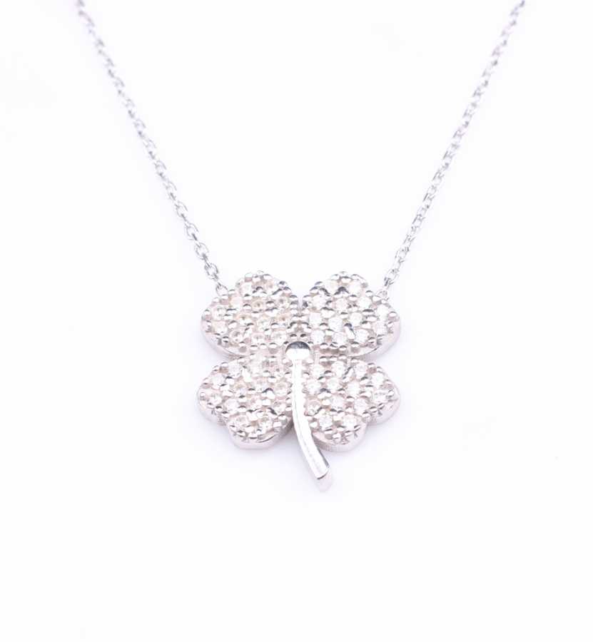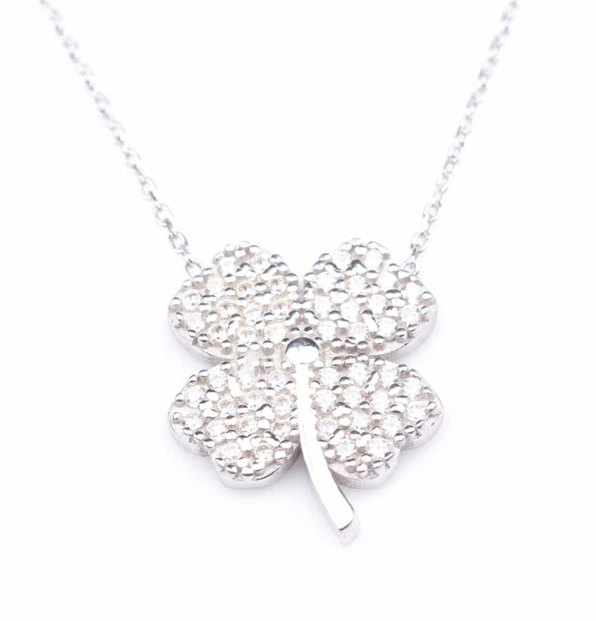 Gümüş kolye 925 ayar gümüşten yapılmıştır. 4 yapraklı yonca şeklindeki kolye 1,5 cm'ye 1,9 cm boyutlarındadır. Zinciri 45 cm uzunluğundadır ve taşları beyaz zirkondur. Ağırlığı 4 gramdır.
