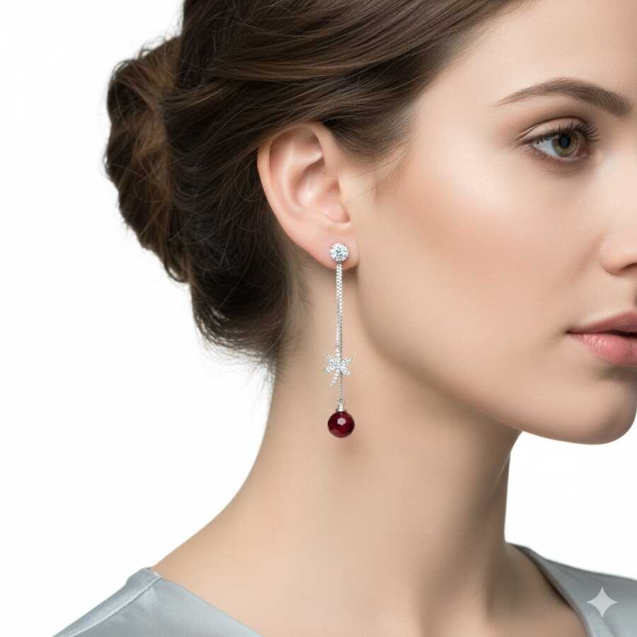 Gümüş küpe 925 ayar gümüşten yapılmıştır. Sallantılı zincirlerle tamamlanan şık küpe 5 cm uzunluğundadır. Küpe yakut renk swarovski taş ve beyaz zirkon taşlıdır. Yakut renk swarovski taş boyutu: 0,9 cm'dir. beyaz zirkon taşlı yusufçuk şeklindeki parça 0,9 cm'ye 1,5 cm boyutlarındadır. Ağırlığı 4,77 gramdır.