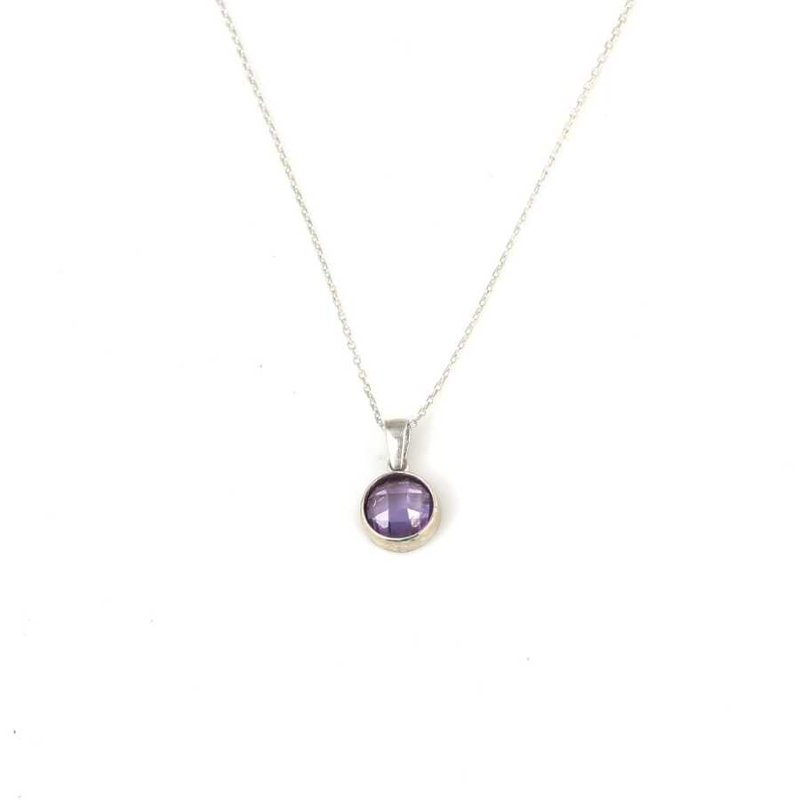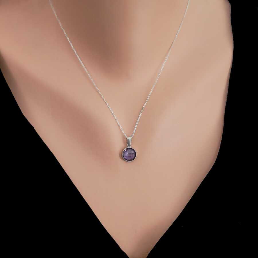 925 Ayar Gümüş Yuvarlak Ametist Renk Taşlı Kolye