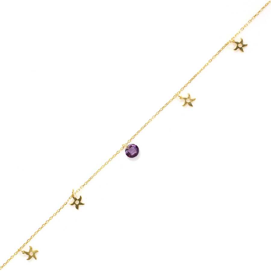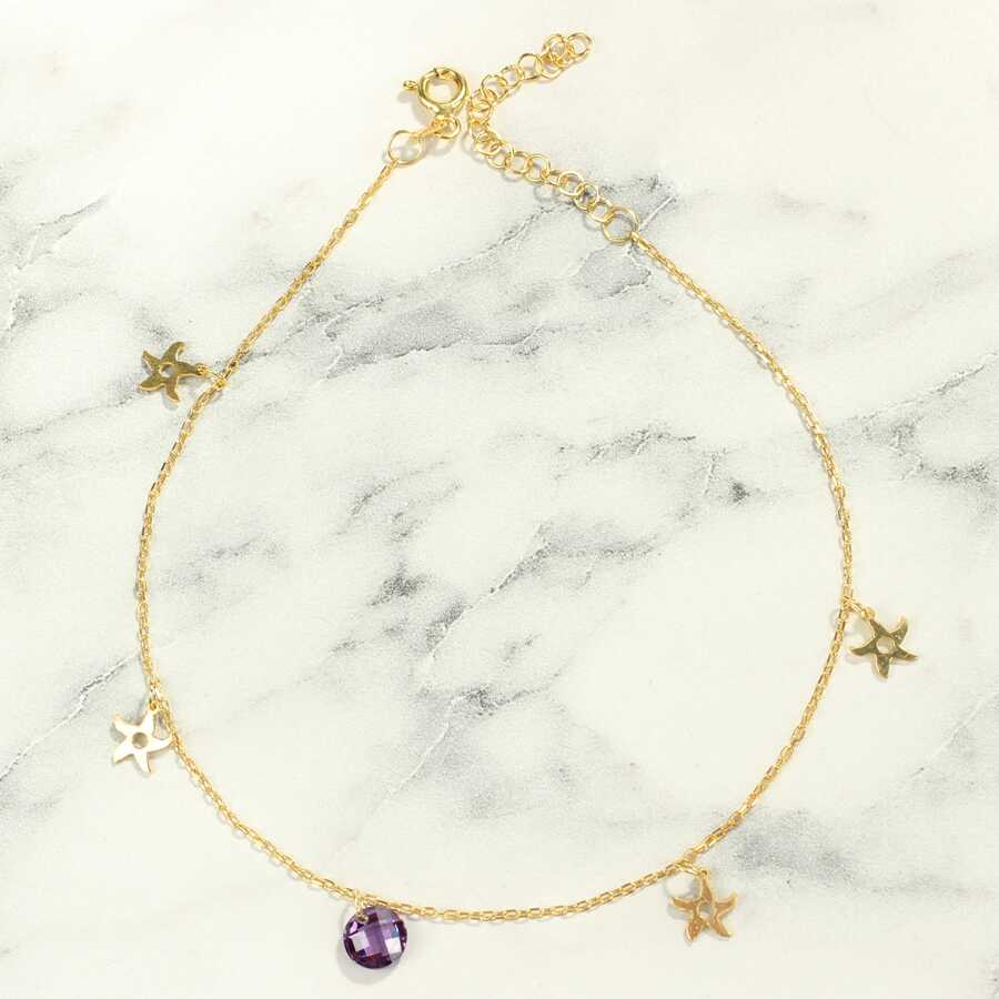 925 ayar gümüştür. Yuvarlak Ametist taşlı 4 adet deniz yıldızı modelden oluşan halhalın uzunluğu: 20,5 cm + 4 cm uzatma zinciri vardır. Ürün Sarı renktedir. Gramı: 1,77 gr925 Ayar Gümüş Yuvarlak Ametist Taşlı Deniz Yıldızı Model Halhal