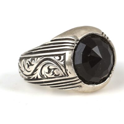 925 Ayar Gümüş Yuvarlak İşlemeli Kollu Oniks Taşlı Erkek Yüzük