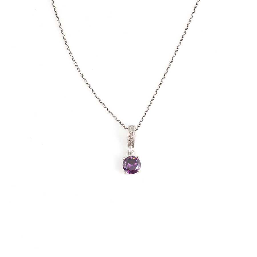 Gümüş kolye 925 ayar gümüşten yapılmıştır. Yuvarlak model kolye 0,6 cm boyutlarındadır. Gümüş kolye 45 cm uzunluğundadır. Kolye ametist renk zirkon taşlıdır. Gümüş renklidir. Ağırlığı 2,16 gramdır.