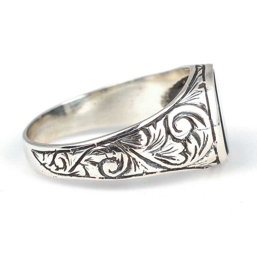Yüzük 925 ayar gümüşten üretilmiştir. Taşlı yüzük 1 cm'ye 1 cm boyutlarındadır. Resimdeki yüzük 23 ölçüdür, ancak tüm ölçüler özel olarak yapılabilmektedir. Yüzük oniks renk taşlıdır. Ağırlığı 5,22 gramdır.