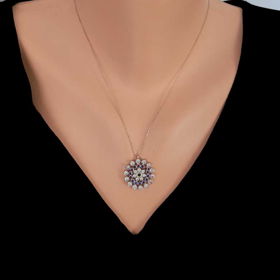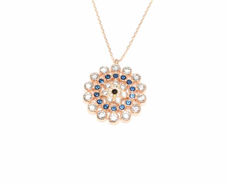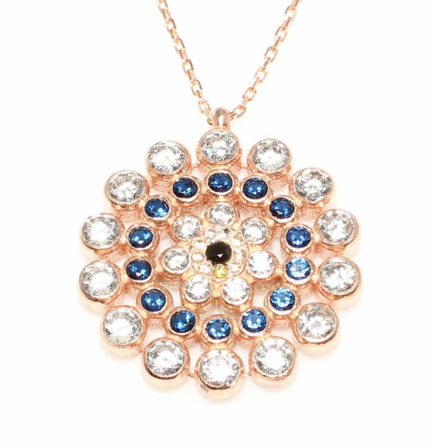 Gümüş kolye 925 ayar gümüşten yapılmıştır. Yuvarlak kolye 2,3 cm boyutlarındadır. Zinciri 42 cm uzunluğundadır. Kolye siyah, mavi ve beyaz zirkon taşlıdır. Rose renklidir. Ağırlığı 6,75 gramdır.
