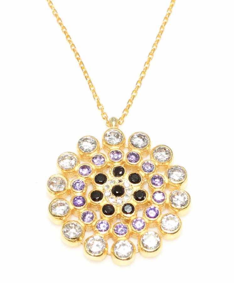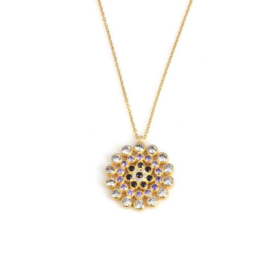925 Ayar Gümüş Yuvarlak Taşlı Kolye, Sarı - Siyah Mor Beyaz Taş