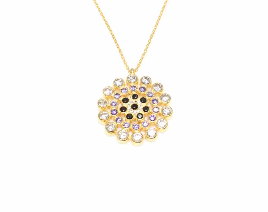 Gümüş kolye 925 ayar gümüşten yapılmıştır. Yuvarlak kolye 2,3 cm boyutlarındadır. Zinciri 42 cm uzunluğundadır. Kolye siyah, mor ve beyaz zirkon taşlıdır. Ağırlığı 6,75 gramdır.