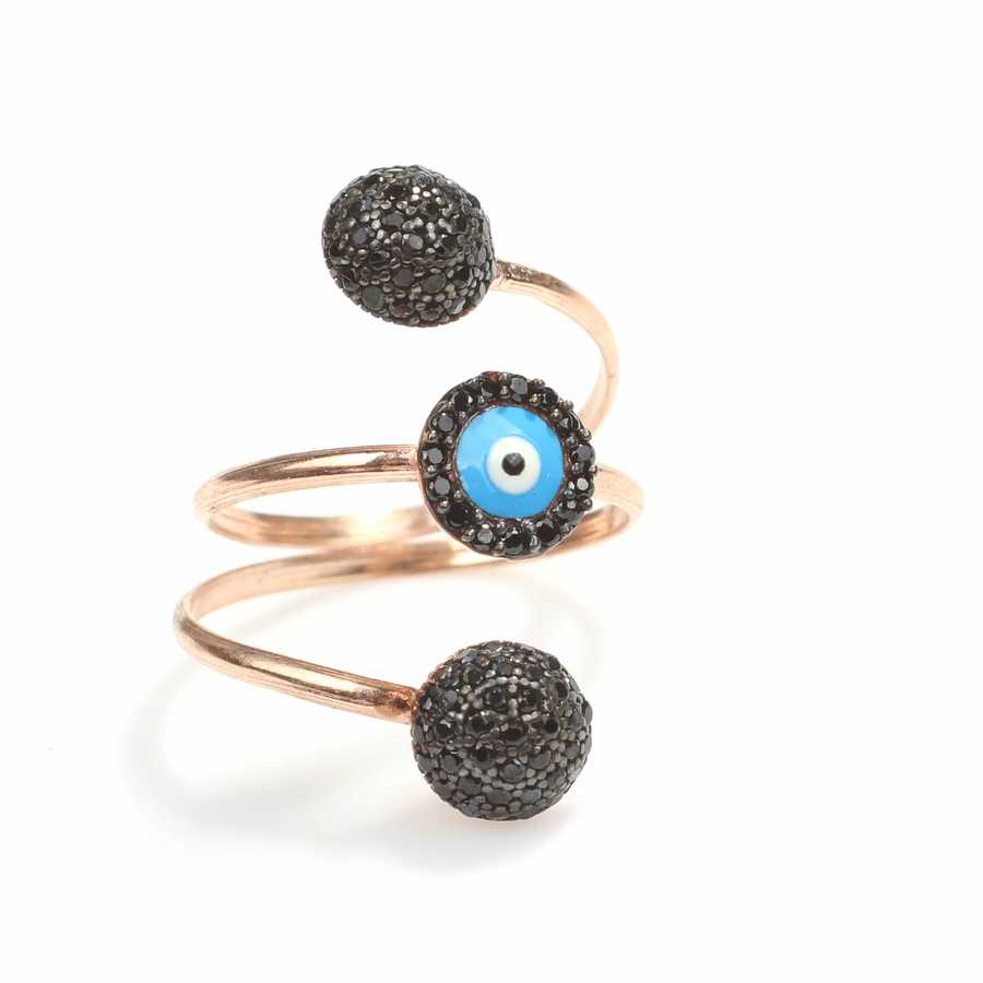 Yüzük 925 ayar gümüşten üretilmiştir. Yarım yuvarlak ve nazar boncuklu 3 sıra tel yüzük 13 ölçüdür. Yüzük siyah zirkon taşlara sahiptir. Ağırlığı 2,07 gramdır.
