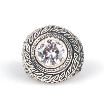 Yüzük 925 ayar gümüşten üretilmiştir. Taşlı yüzük 1 cm boyutlarındadır. Resimdeki yüzük 17 ölçüdür, ancak tüm ölçüler özel olarak yapılabilmektedir. Yüzük zirkon taşlıdır. Ağırlığı 7,95 gramdır.