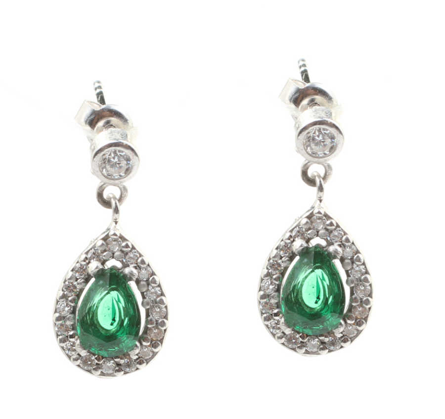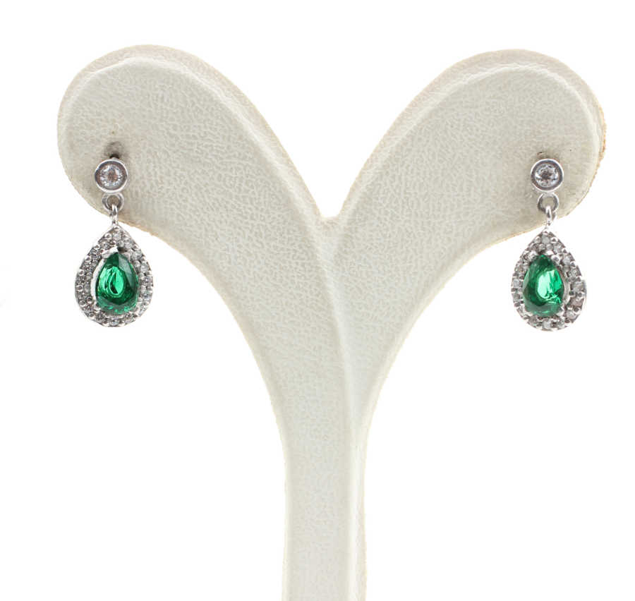Gümüş küpe 925 ayar gümüşten yapılmıştır. Şık damla taşlı anturaj model küpe 2,0 cm'ye 0,9 cm boyutlarındadır. Küpe beyaz zirkon ve sentetik zümrüt taşlıdır. Ağırlığı 3,43 gramdır.