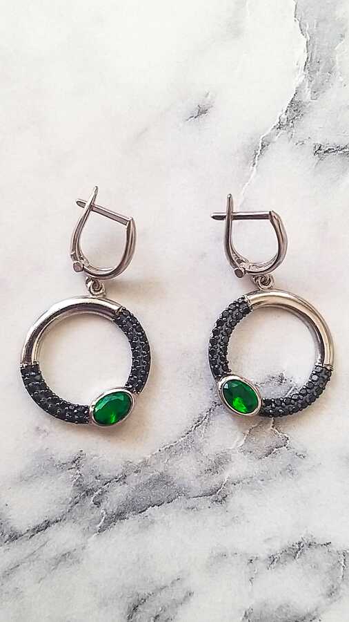 Gümüş küpe 925 ayar gümüşten yapılmıştır. Taşlı yuvarlak model küpe 3,4 cm'ye 1,9 cm boyutlarındadır. Küpe siyah ve zümrüt renk zirkon taşlıdır. Ağırlığı 4 gramdır.