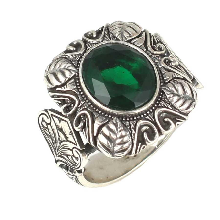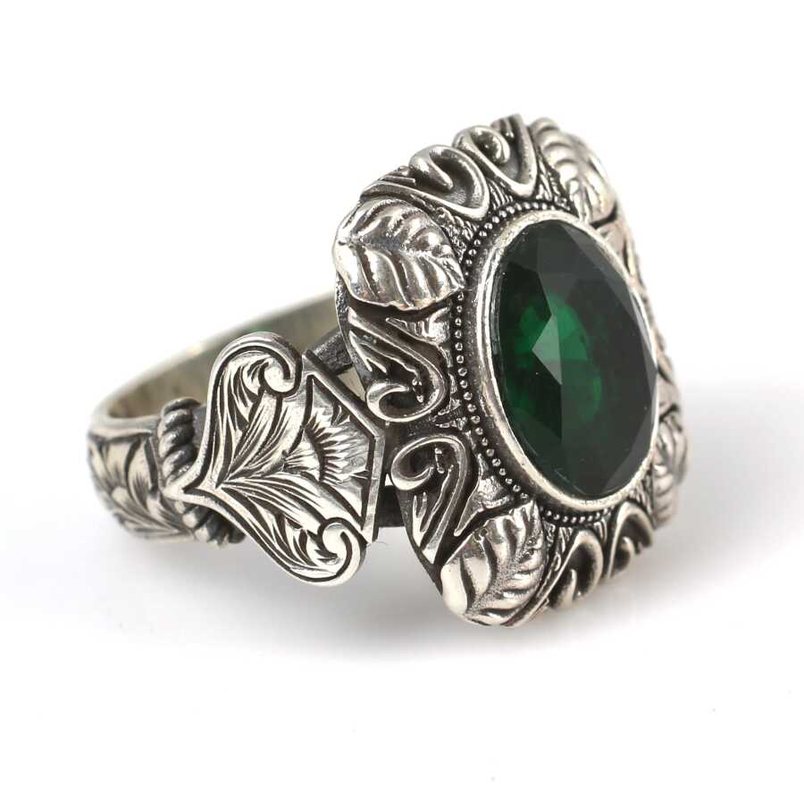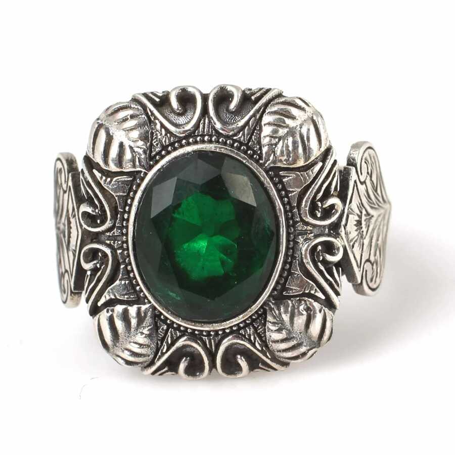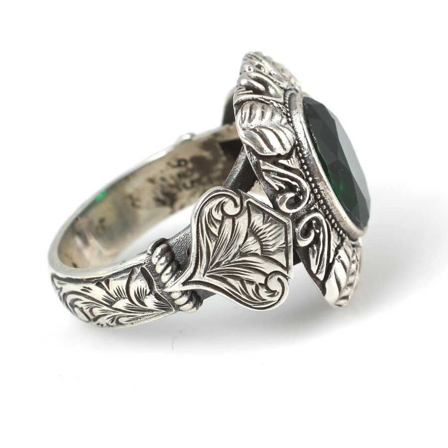 Yüzük 925 ayar gümüşten üretilmiştir. Taşlı yüzüğün üst kısmı 2,1 cm boyutlarındadır. Resimdeki yüzük 21 ölçüdür, ancak tüm ölçüler özel olarak yapılabilmektedir. Yüzük zümrüt renk taşlıdır. Ağırlığı 11,94 gramdır.