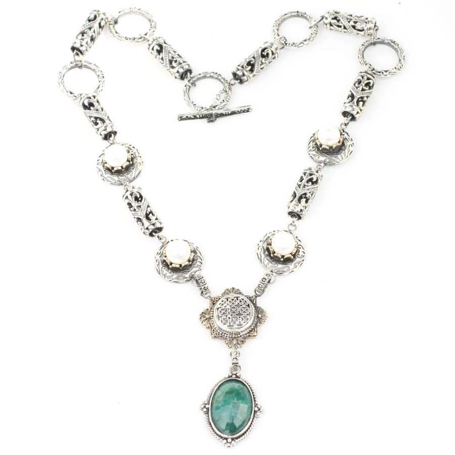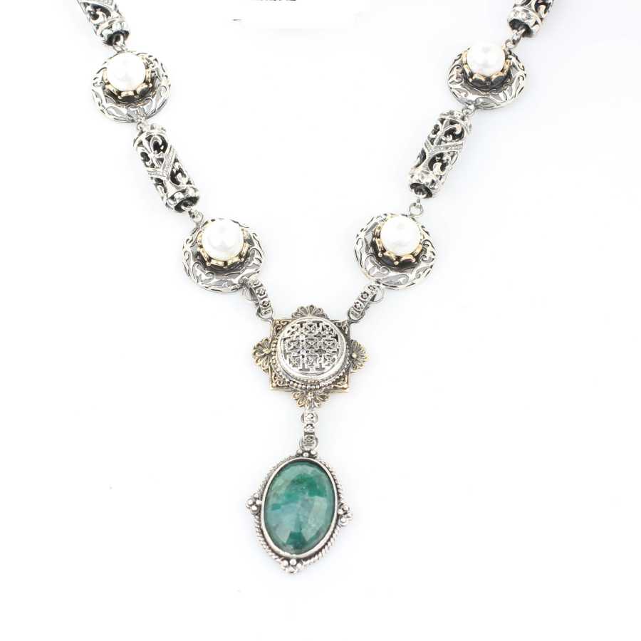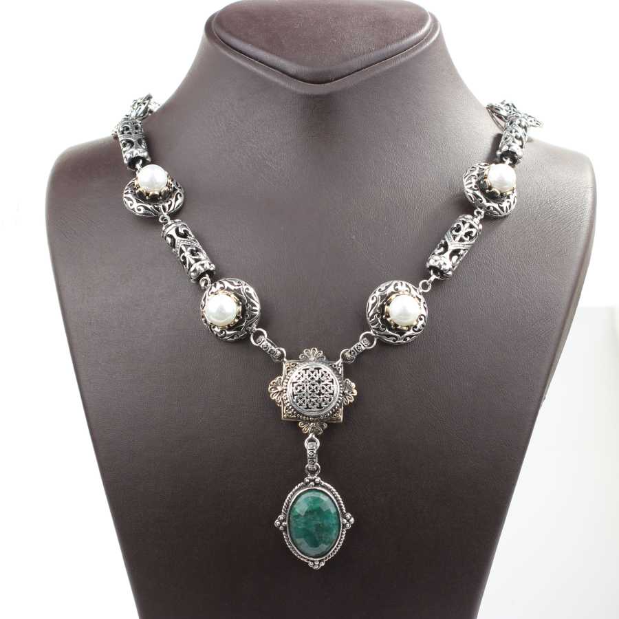 925 ayar gümüştür. Antik zaman Bizans motiflerinden alıntı yapılarak tasarlanmış ürün 50 cm uzunluğunda incili zümrüt taşlı kolyeGramı:95,75