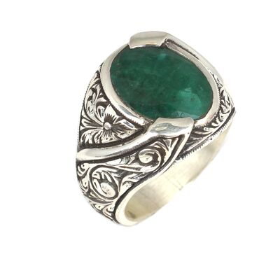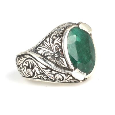 Yüzük 925 ayar gümüşten üretilmiştir. Yüzüğün üzerinde el kalemi atılarak tasarlanmıştır. Taşlı yüzük 1,7 cm'ye 1,3 cm boyutlarındadır. Resimdeki yüzük 26 ölçüdür, ancak tüm ölçüler özel olarak yapılabilmektedir. Yüzük kök zümrüt taşlıdır. Ağırlığı 22,19 gramdır.