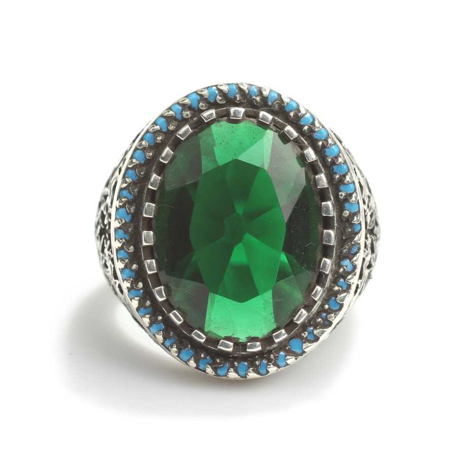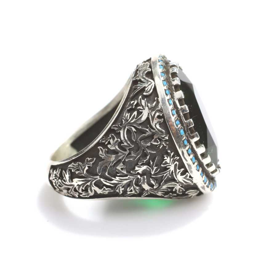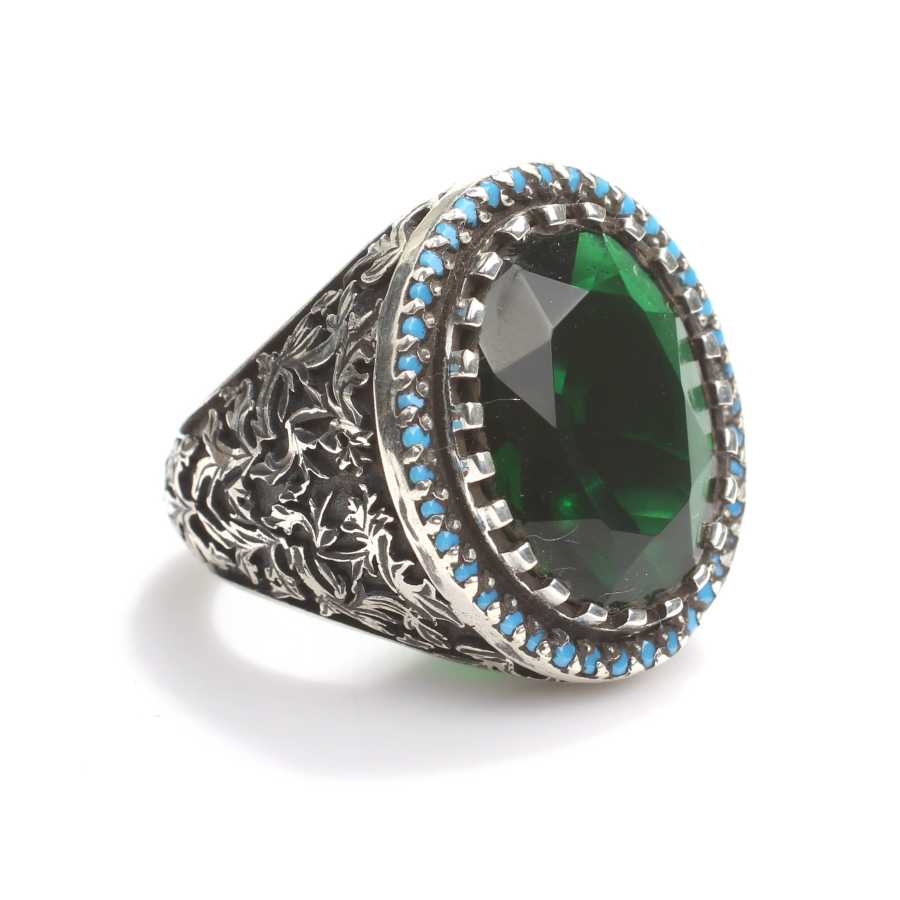 Yüzük 925 ayar gümüşten üretilmiştir. Taşlı yüzük 2,5 cm'ye 2,0 cm boyutlarındadır. Resimdeki yüzük 20 ölçüdür, ancak tüm ölçüler özel olarak yapılabilmektedir. Yüzük turkuaz renk ve sentetik zümrüt taşlıdır. Ağırlığı 15,59 gramdır.