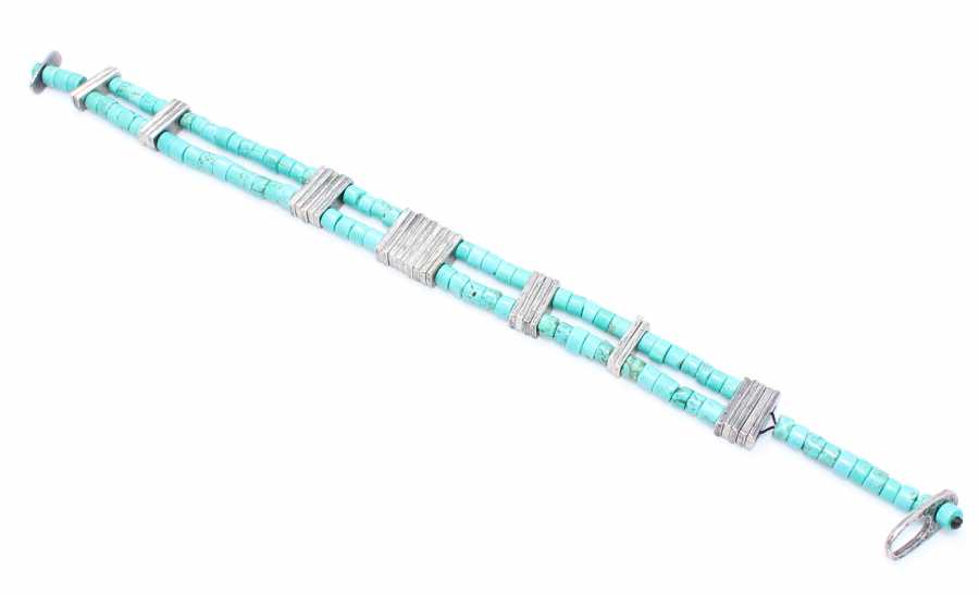 Bileklik 925 ayar gümüşten imal edilmiştir. Taşlı bileklik 20 cm uzunluğundadır. Bileklik turkuaz taşları dizilerek aralarında gümüş parçalar eklenerek tasarlanmıştır. Gümüş bileklik 31,95 gram ağırlığındadır.