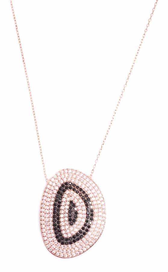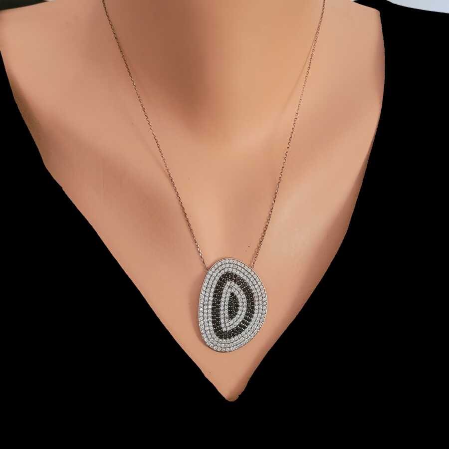 Gümüş kolye 925 ayar gümüşten yapılmıştır. Çokgen şekilli kolye 45 cm uzunluğundadır. Kolye zirkon taşlıdır. Ağırlığı 8,03 gramdır.